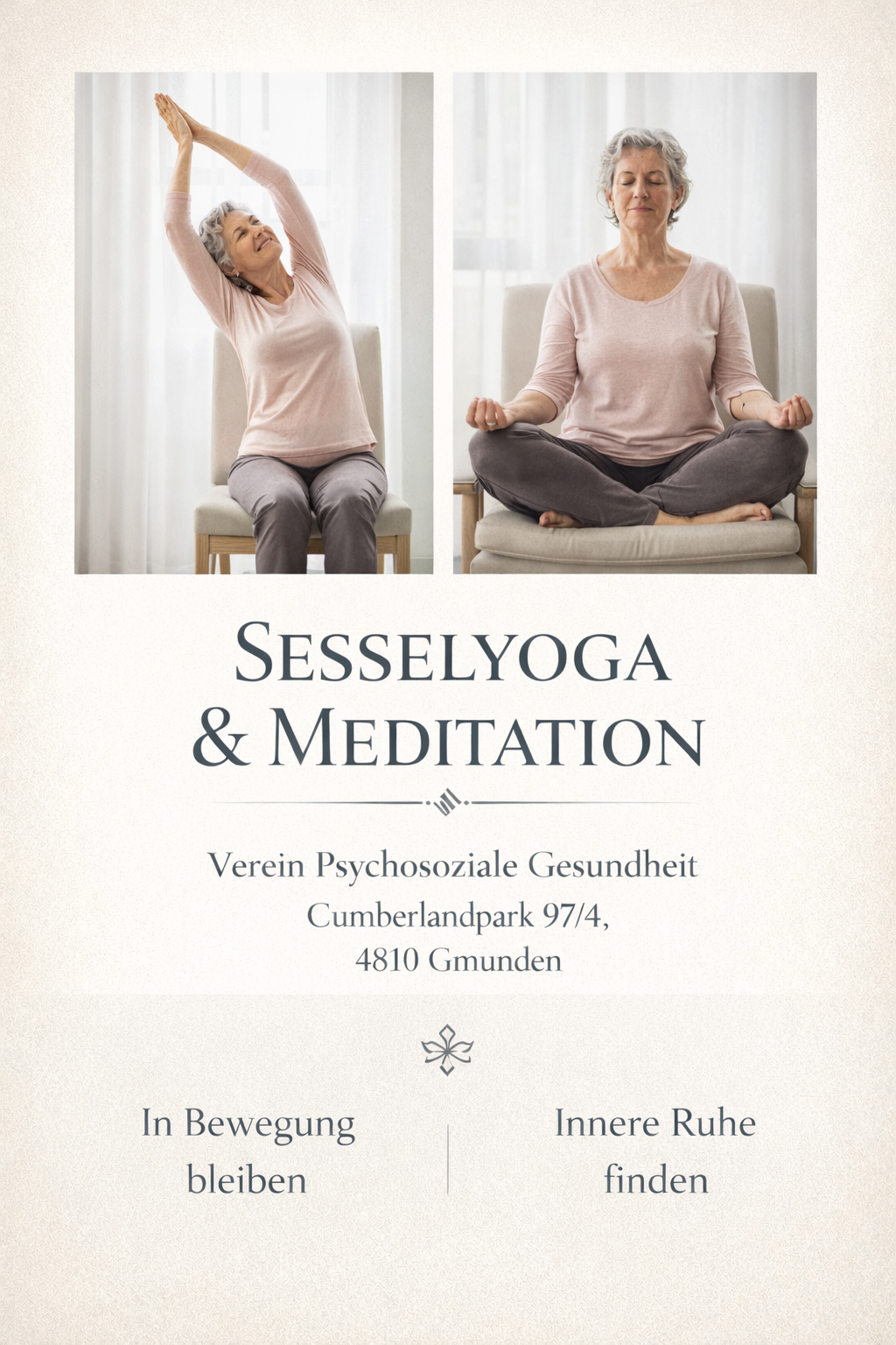 Sesselyoga unterstützt dich dabei, Kraft und Beweglichkeit zu erhalten, innere Ruhe zu finden und dich im Alltag getragen zu fühlen.