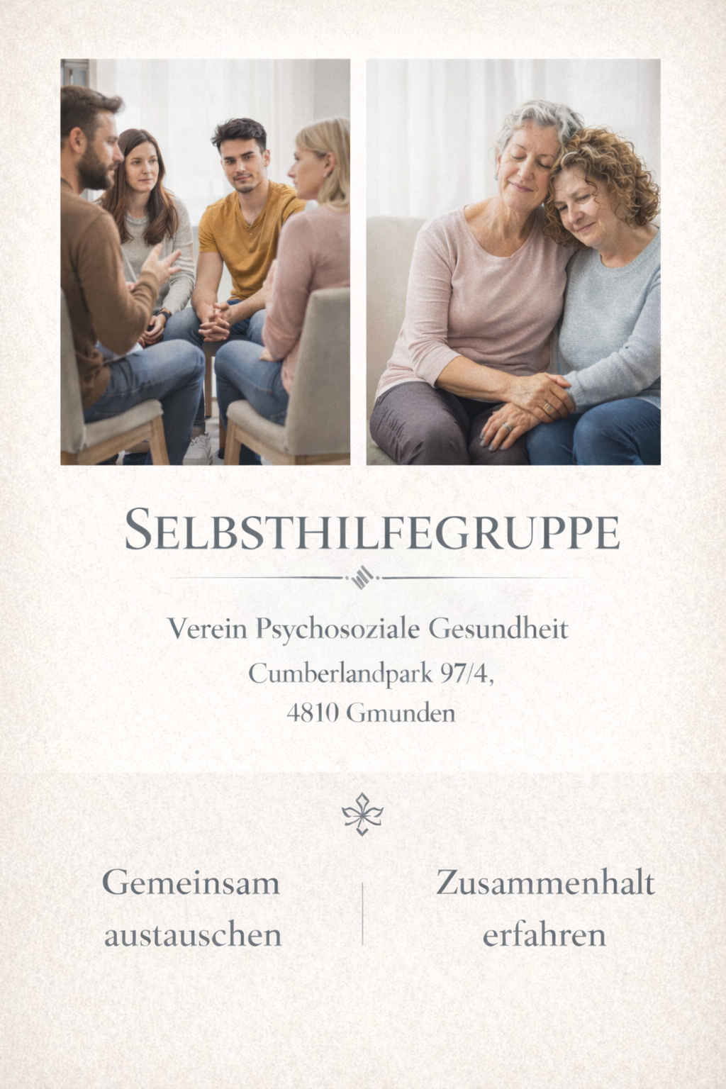 Die Selbsthilfegruppe begleitet dich dabei, deine psychosoziale Gesundheit behutsam zu stärken und dich wieder mehr mit dir selbst und anderen verbunden zu fühlen.